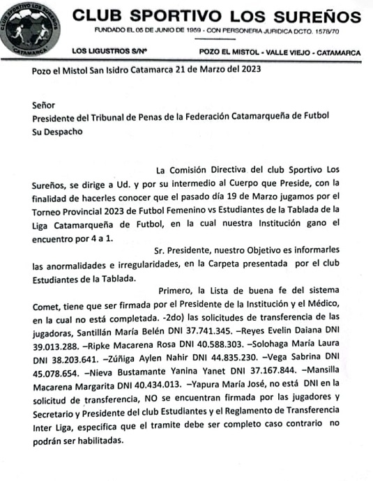 Inicialmente, se conoció la protesta de Estudiantes de La Tablada, que reclamó los puntos por el cotejo aludido, según anticipó su presidente Carlos Bazán, por la “supuesta mala inclusión de varias jugadoras”, entre ellas Melody Oviedo, autora de tres los goles para el elenco de Pozo El Mistol, que “no tiene ninguna documentación”, según le dijo el titular “Pincha” al programa “Club Deportivo”, que se emite por radio El Esquiú 95.3.