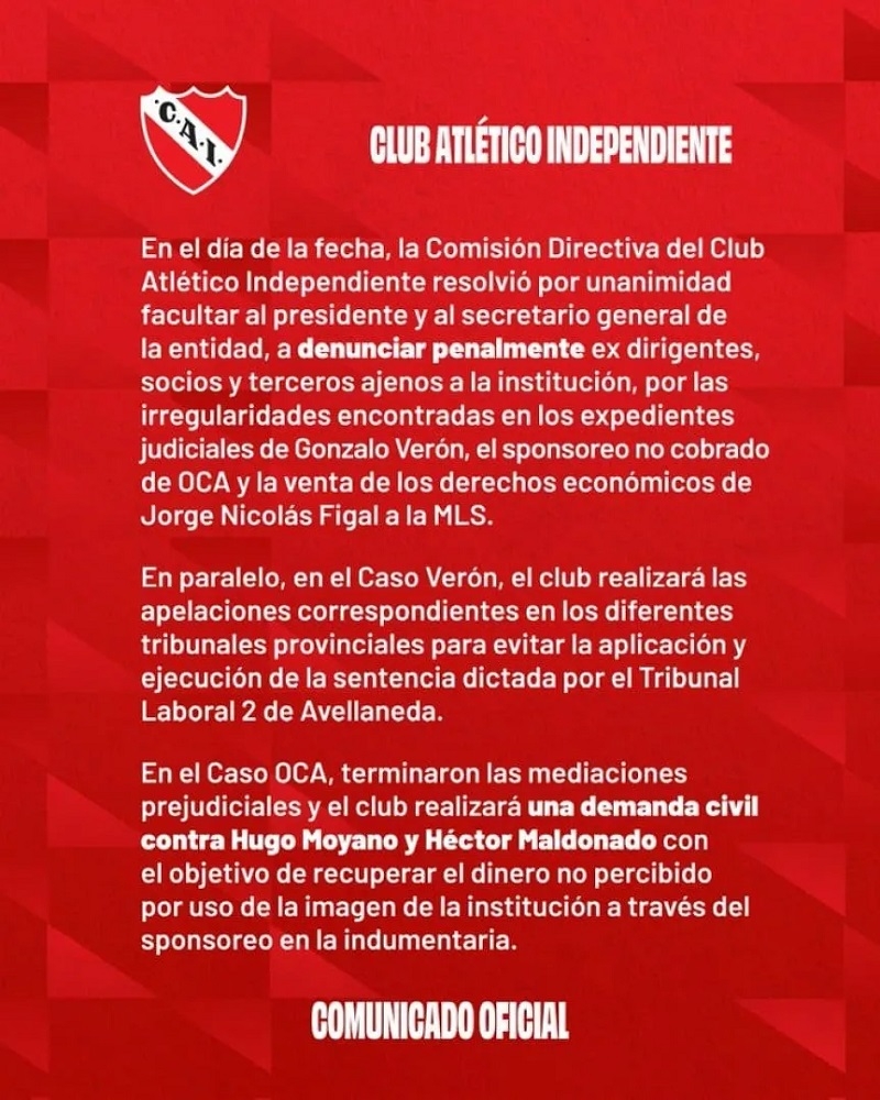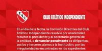 "En el día de la fecha, la Comisión Directiva del Club Atlético Independiente resolvió por unanimidad facultar al presidente y al secretario general de la entidad, a denunciar penalmente ex dirigentes, socios y terceros ajenos a la institución..." comienza la contundente proclama del Rojo que fue publicada en sus redes sociales.