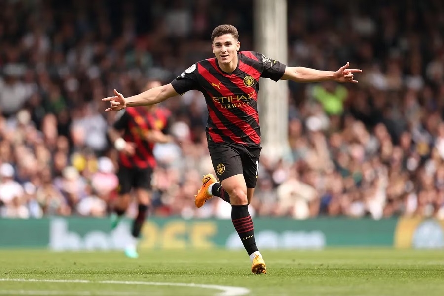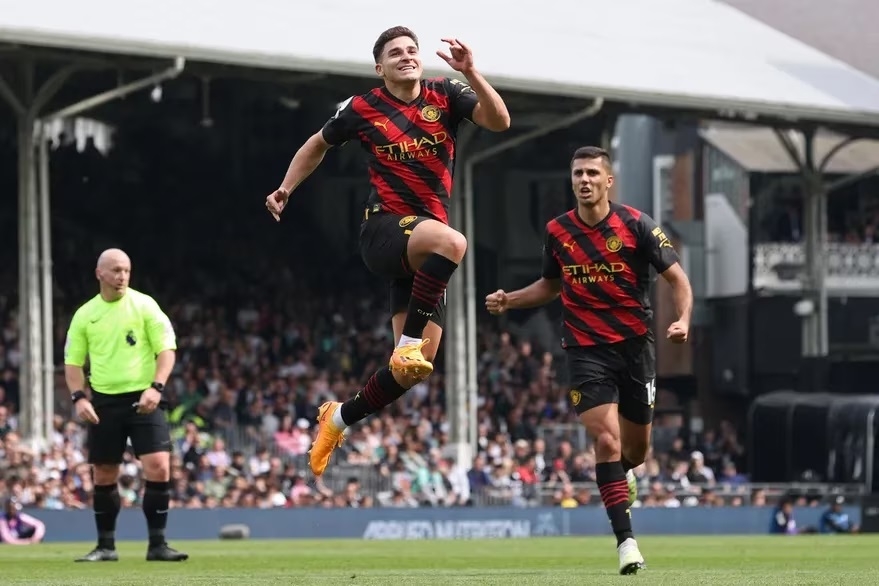 Manchester City continúa con su implacable persecución al Arsenal, en su objetivo de obtener la Premier League. Por lo pronto, dio otro paso: venció 2 a 1 a Fulham, en un partido correspondiente a la 34º fecha. En el compromiso de este domingo, Pep Guardiola eligió colocar como titulares a sus dos centrodelanteros: Erling Haaland como faro del área y Julián Álvarez un tanto más retrasado. Y esa fórmula surtió resultados de inmediato, ya que el noruego anotó de penal, mientras que el campeón del mundo convirtió un golazo desde fuera del área, que recuerda a su partido consagratorio de aquel superclásico en el Monumental, en el último tramo de la era Gallardo.