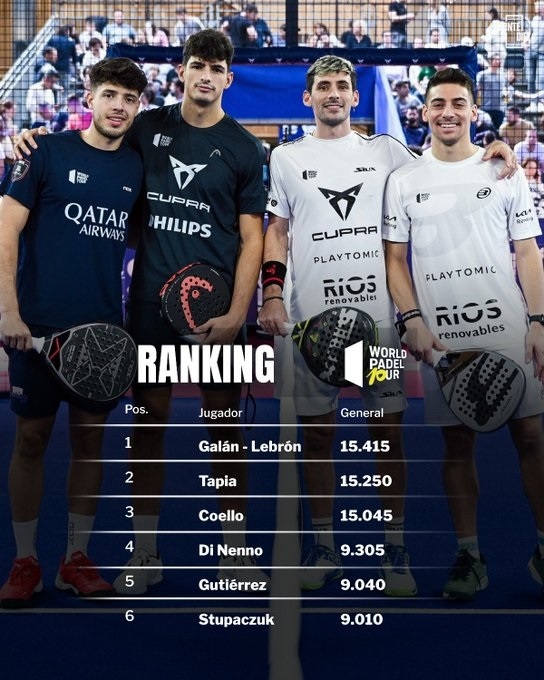 Desde este lunes, el ranking se actualizará con los resultados del Open de Bruselas. Ale Galán y Juan Lebrón, al no haber participado, perderán los 1.000 puntos que tenían en su cuenta por haber ganado en 2022. Los españoles quedarán con 15.415 puntos, mientras que Tapia escala hasta los 15.250 y Coello, a 15.045. Es decir que quedarán a 535 unidades de distancia, las cuales se pondrá en disputa en el Open 1000 de Vigo (del 8 al 14 de mayo).