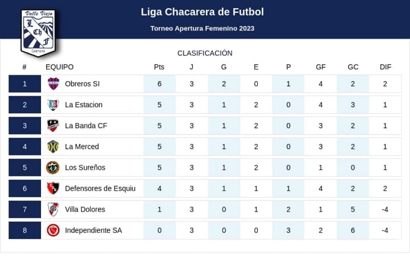 Actuales posiciones: Obrerdos 6 Pts.; La Estación La Banda CF, La Merced y Los Sureños 5; Def. de Esquiú 4; Villa Dolores 1 e Independiente de San Antonio 0.