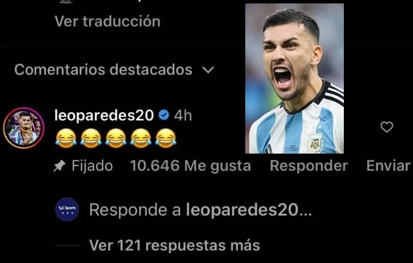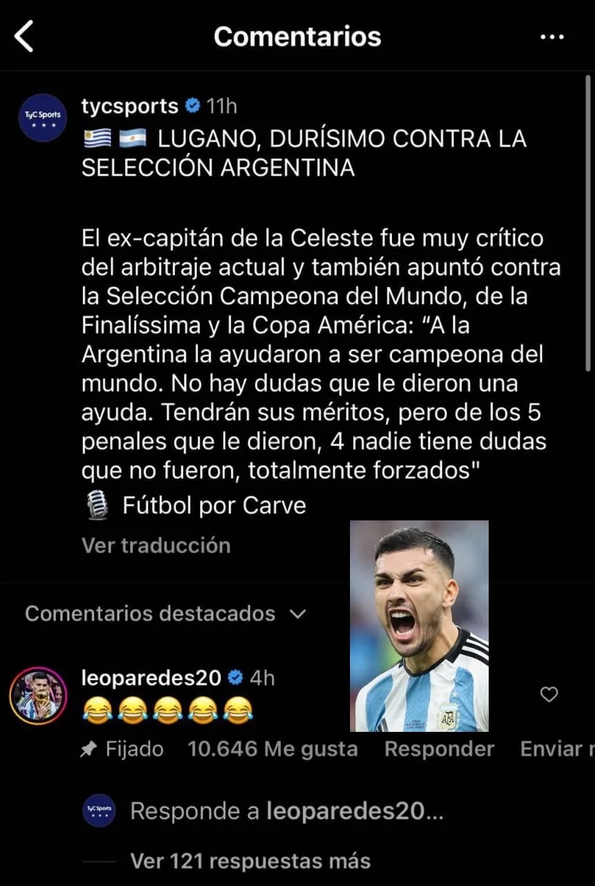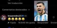 En las últimas horas, Leandro Paredes leyó los dichos del histórico defensor charrúa en un posteo del Instagram de TyC Sports y no pudo evitar contestarle. Su respuesta: cinco emojis de risa que rápidamente explotó en likes y comentarios.