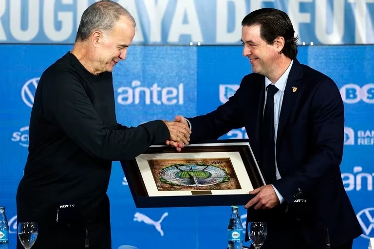 “Estoy poniendo el dedo en la parte del cuadro que me regalaron donde vine a ver el Mundialito. Yo era estudiante de educación física y con unos compañeros, de ciruja, subimos al auto y nos vinimos acá. Sin entradas, sin plata, sin nada. Vimos todos los partidos sin cometer delitos y ya me enamoré no de Uruguay, estaba enamorado del fútbol. Cuando uno es recibido en un país que no es el propio, hay que ser muy cuidadoso de lo que se dice para que no se confunda con demagogia. Ese deseo de agradar diciendo algo de lo que uno no está convencido. Yo tengo una dimensión como entrenador, la conozco, el fútbol uruguayo tiene una entidad basada en su pasado y presente, lo que construyó en los últimos 10 y 15 años, si hay proporción entre la entidad y lo profesional que yo soy, lo que pasó en la historia del fútbol uruguayo dejémoslo. Pero en los últimos 15 años hubo una expresión mucho más grande que lo que hice yo como entrenador. Es desproporcionada la expectativa y exagerada. Se pueden buscar datos y decir si tengo o no razón”.