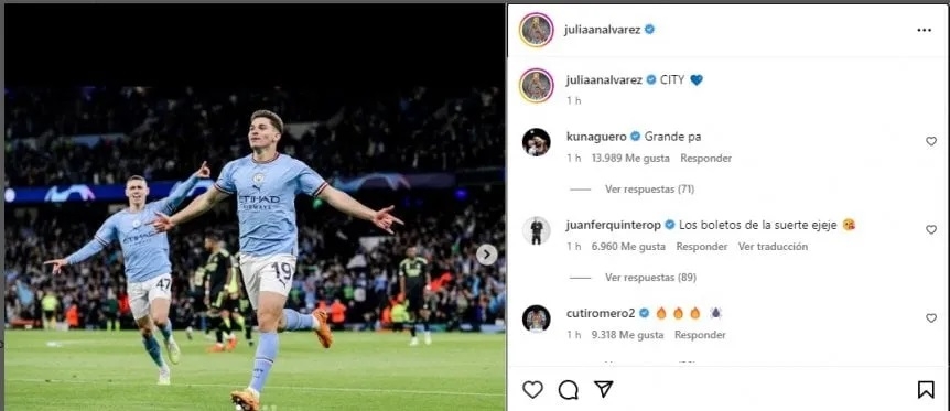 "Grande, pa", le escribió el Kun, emblema de los Citizens y quien fue su compañero en la Selección Argentina. A su vez, el Cuti Romero -defensor del Tottenham y del conjunto nacional- le comentó con emojis de fuego y una araña.