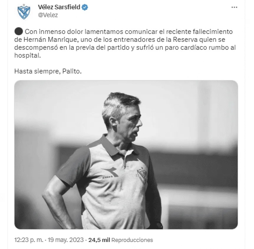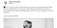 "Con inmenso dolor lamentamos comunicar el reciente fallecimiento de Hernán Manrique, uno de los entrenadores de la Reserva quien se descompensó en la previa del partido y sufrió un paro cardíaco rumbo al hospital. Hasta siempre, Palito", escribió Vélez en sus redes sociales, donde compartió la triste noticia.