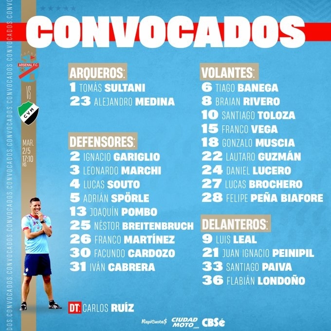 Arsenal: Alejandro Medina; Lucas Souto, Néstor Breitenbruch, Joaquin Pombo, Adrián Sporle; Tiago Banega, Felipe Peña, Santiago Toloza, Lautaro Guzmán; Santiago Paiva y Luis Leal. DT: Carlos Ruiz.