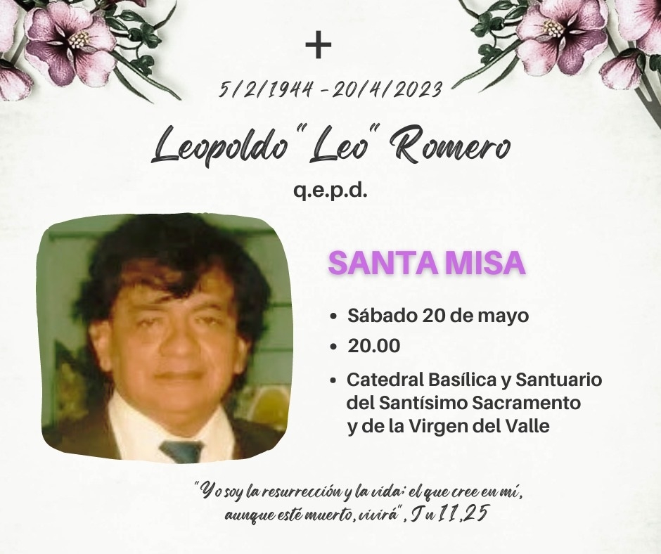 La familia del periodista Leopoldo “Leo” Romero, fallecido el 20 de abril pasado, al cumplirse el primer mes de su fallecimiento hará oficiar una misa en su memoria, este sábado 20 de mayo, a las 20 Hs.
