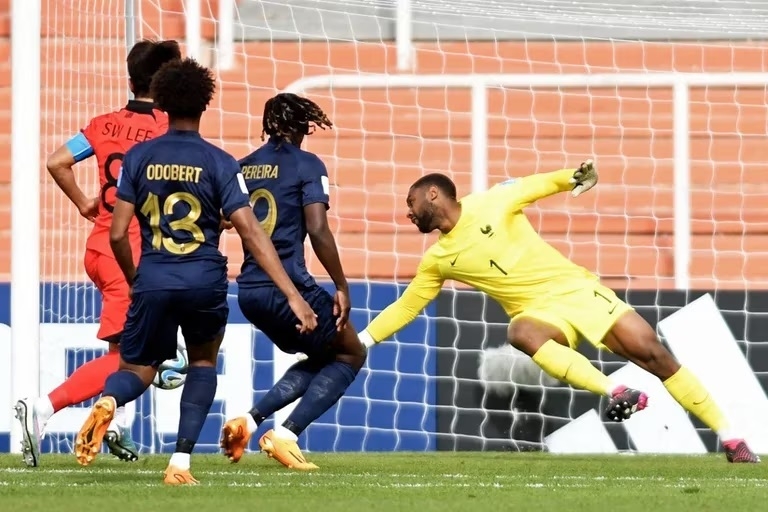 Lee Seung-Won abrió el marcador a los 22 minutos tras un contragolpe que descolocó a la defensa y a los 64 amplió de cabeza al primer palo Lee Young-Jun para los asiáticos gracias a una muy buena jugada preparada. Descontó para los europeos Alan Virginius, tras un polémico penal que sancionó el árbitro colombiano Jhon Alexander Ospina Londoño, quien sancionó un choque dentro del área entre el arquero coreano sobre y el delantero francés.
