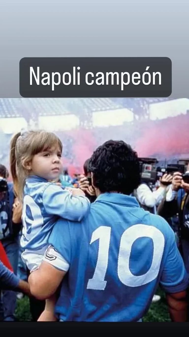 Las hijas de Maradona también manifestaron su emoción por el triunfo de Napoli. Dalma Maradona en su cuenta oficial de Instagram, compartió una foto que se remonta a una consagración anterior, en donde formó parte de los festejos. Gianinna, por su parte, publicó una historia en la previa del partido entre Napoli y Udinese. “Es hoy”, escribió en su perfil.