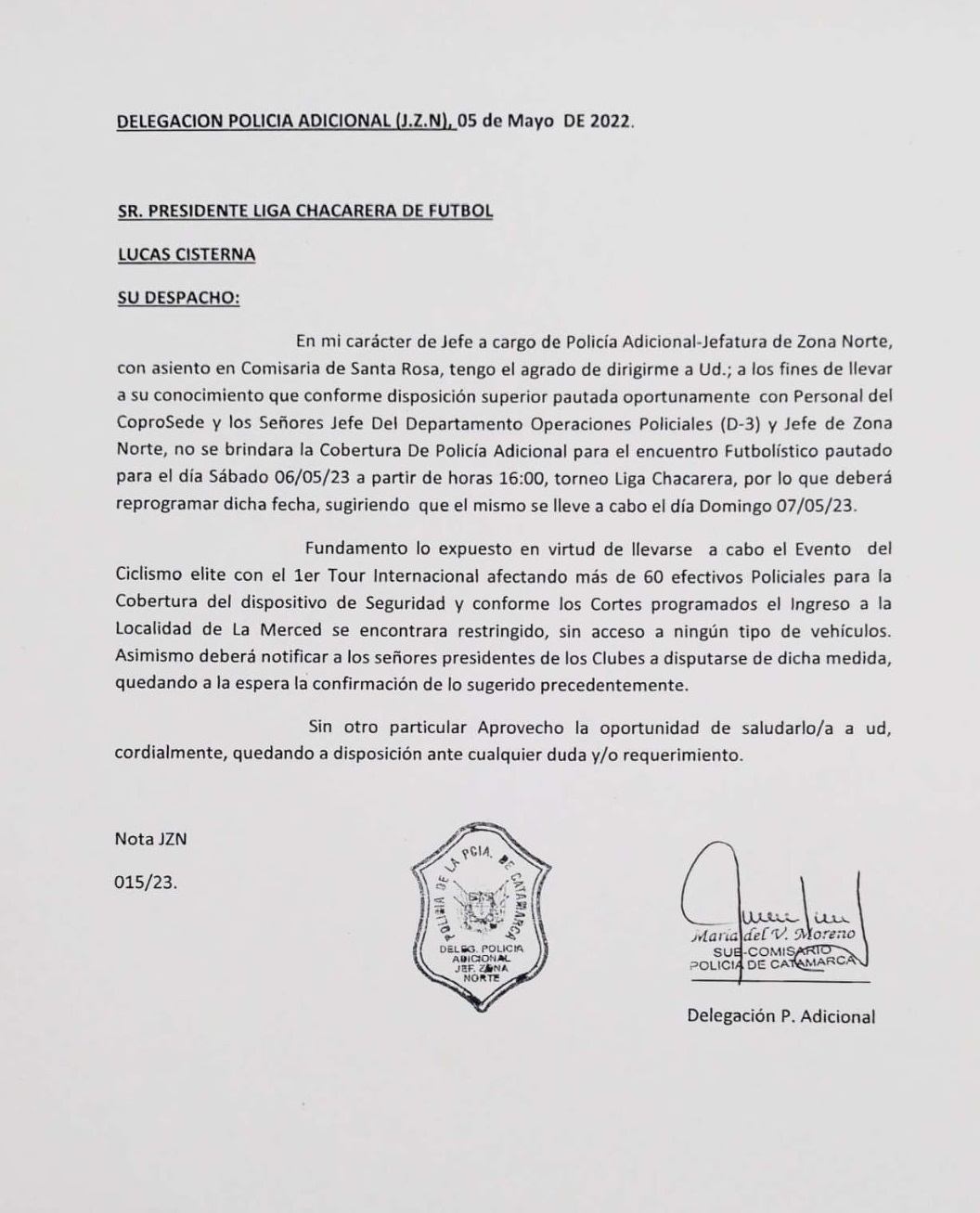 La Liga Chacarera de Fútbol comunica que en virtud de la notificación cursada a nuestra entidad en el día de ayer viernes, en horas de la noche por la Delegación de Policía Adicional Zona Norte, nos vemos en la obligación de postergar el partido de Primera División programado para el día de la fecha entre los Clubes Deportivo La Merced y Defensores de Esquiu, en la Localidad de la Merced Departamento Paclin, debido a la falta de adicionales policíales, como consecuencia del evento de ciclismo internacional que se desarrolla en nuestra provincia.