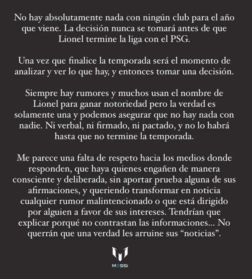 Asimismo, el mensaje también condena las versiones surgidas desde Francia que indicaban un acuerdo total con Al Hilal: "Siempre hay rumores y muchos usan el nombre de Lionel para ganar notoriedad, pero la verdad es solamente una y podemos asegurar que no hay nada con nadie. Ni verbal, ni firmado, ni pactado y no lo habrá hasta que no termine la temporada. Me parece una falta de respeto hacia los medios donde responden, que haya quienes engañen de manera consciente y deliberada, sin aportar prueba alguna de sus afirmaciones y queriendo transformar en noticia cualquier rumor malintencionado o que está dirigido por alguien a favor de sus intereses. Tendrían que explicar porqué no contrastan las informaciones... No querrán que una verdad les arruine sus 'noticias'".