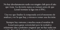 "No hay absolutamente nada con ningún club para el año que viene. La decisión nunca se tomará antes de que Lionel termine la liga con el PSG. Una vez que finalice la temporada será el momento de analizar y ver lo que hay, y entonces tomar una decisión", reza el inicio del comunicado emitido a través de las redes sociales.