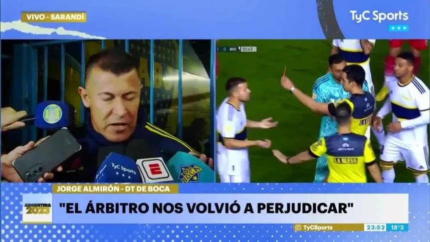 Tras el encuentro, las caras largas eran notorias en el equipo xeneize y si bien en un principio se anunció que el entrenador no iba a brindar la conferencia de prensa, luego se informó que hablaría, pero no aceptaría preguntas. El insólito diálogo se dio de este modo, con un Jorge Almirón evidentemente ofuscado por el grave error del cuerpo arbitral integrado por el juez principal Leandro Rey Hilfer y con Hernán Mastrángelo a cargo del VAR, que expulsó de mala manera a Weigandt en el inicio del complemento.