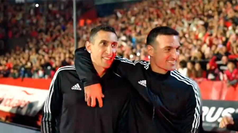 Al momento de salir los invitados al campo de juego, Di María lo hizo acompañado de otros campeones como el DT Lionel Scaloni -formado en Newell's- y Leandro Paredes, con quienes volvió a escuchar aplausos y expresiones de agradecimiento.