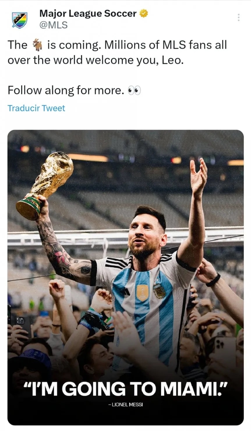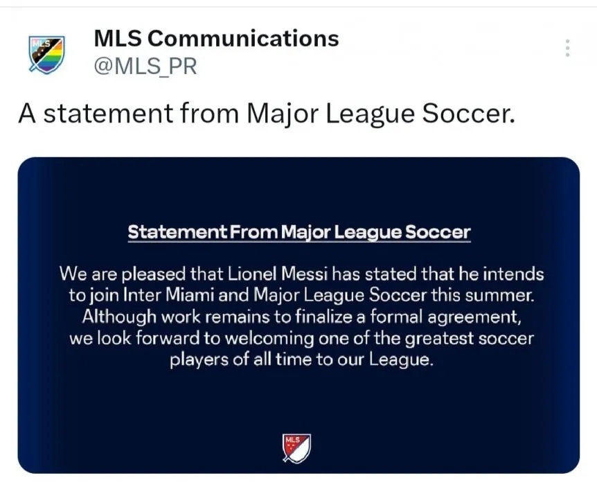 Lionel Messi sacudió al mundo del fútbol al anunciar que continuará su ilustre carrera profesional en Inter Miami una vez finalizado su contrato con PSG. Esta noticia también generó la reacción de MLS, que en primera instancia brindó un comunicado formal en su cuenta Relaciones Pública y minutos más tarde en su cuenta oficial.