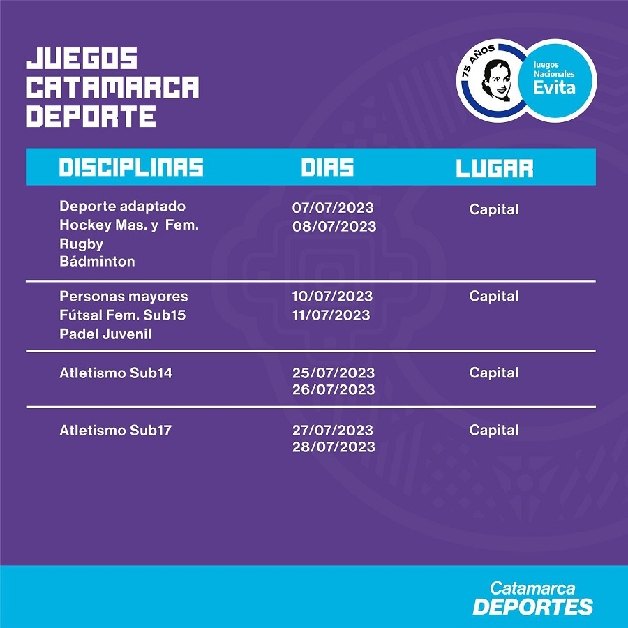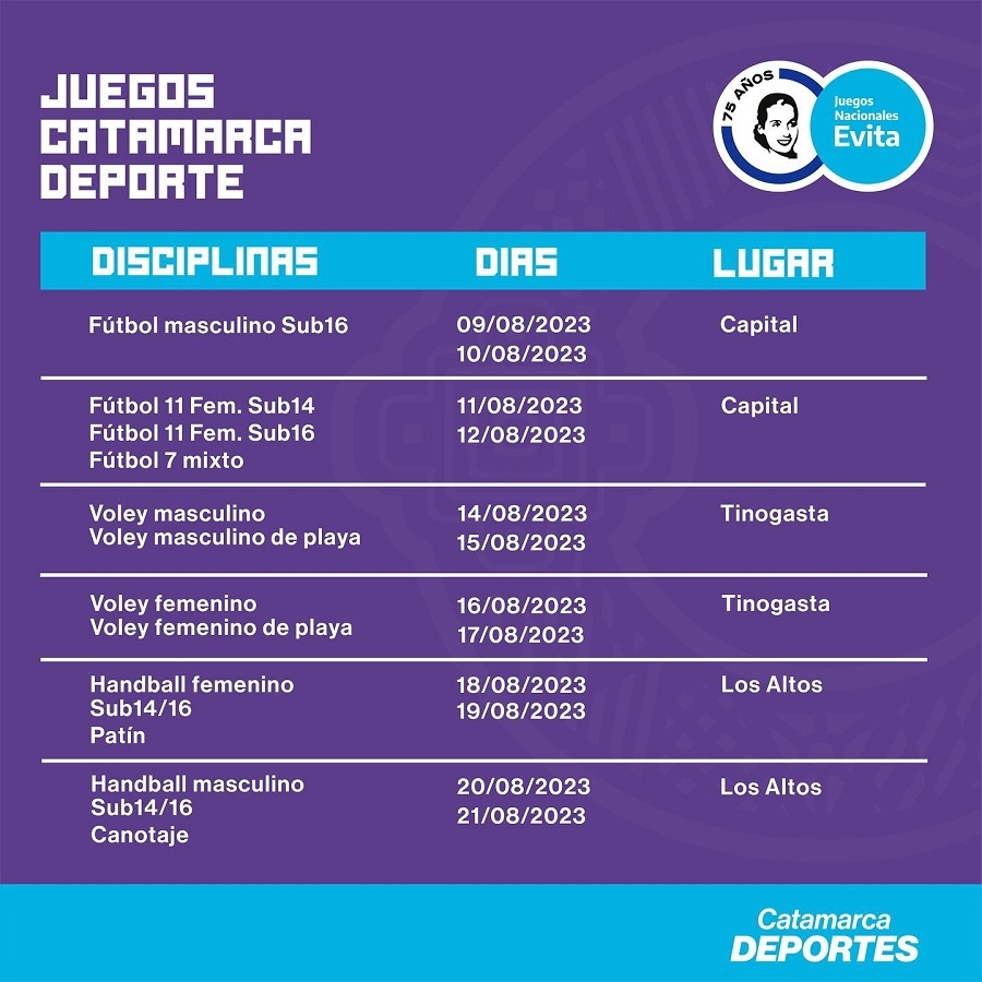 - Miércoles 16 y jueves 17 de agosto: Voley Femenino y Beach Voley Femenino. (Tinogasta)