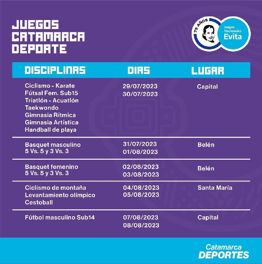 - Lunes 14 y martes 15 de agosto: Voley Maculino y Beach Voley Masculino. (Tinogasta)