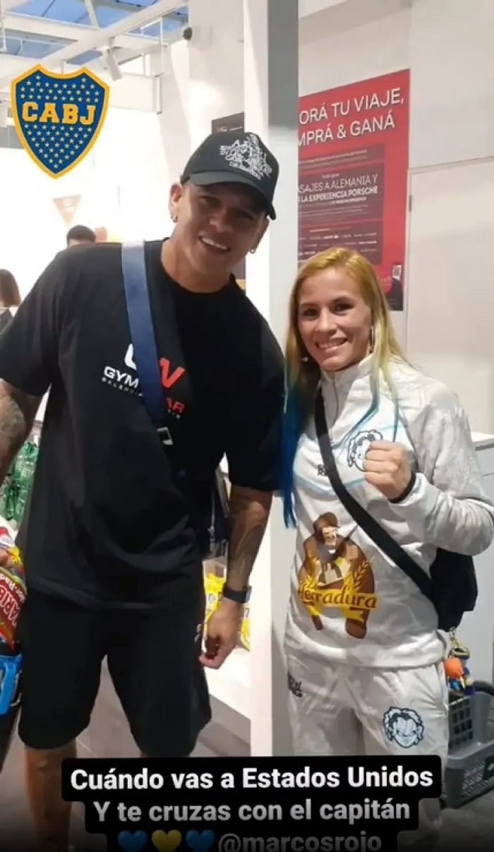 A través de las redes se pudo ver a Rojo en el Aeropuerto de Ezeiza, por partir al país norteamericano, fotografiándose junto a la boxeadora y campeona del mundo Celeste "Chucky" Alaniz, quien fue la encargada de subir a sus redes la imagen con el futbolista.
