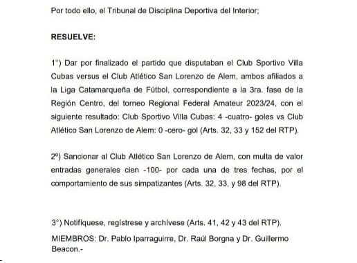 Asimismo, el TDI sancionó a San Lorenzo de Alem “con multa del valor de 100 entradas generales, por tres fechas…por el comportamiento de sus simpatizantes”.