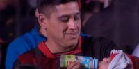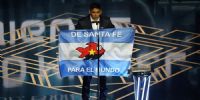 El santafesino subió al escenario con una bandera de argentina con un pescado de Colón en el medio y junto a su hijo que se largó a llorar en dicho momento.