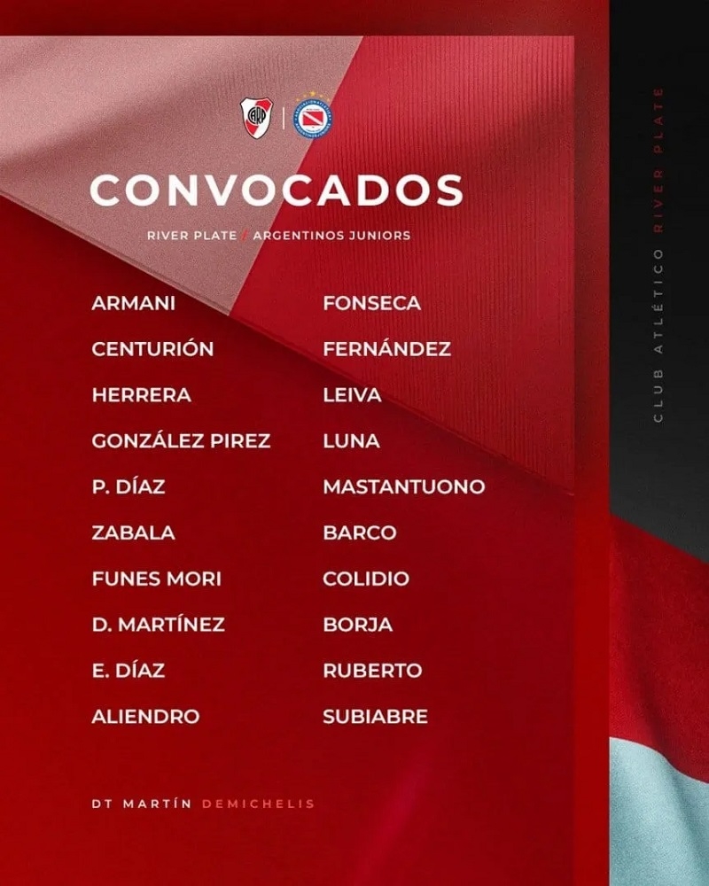 Eso sumado a que aún no llegaron refuerzos lo obligó a recurrir a las formativas del club y tendrán su primera vez en una nómina Franco Mastantuono, Daniel Zabala, Tobías Leiva, Jonás Luna, Agustín Ruberto e Ian Subiare.