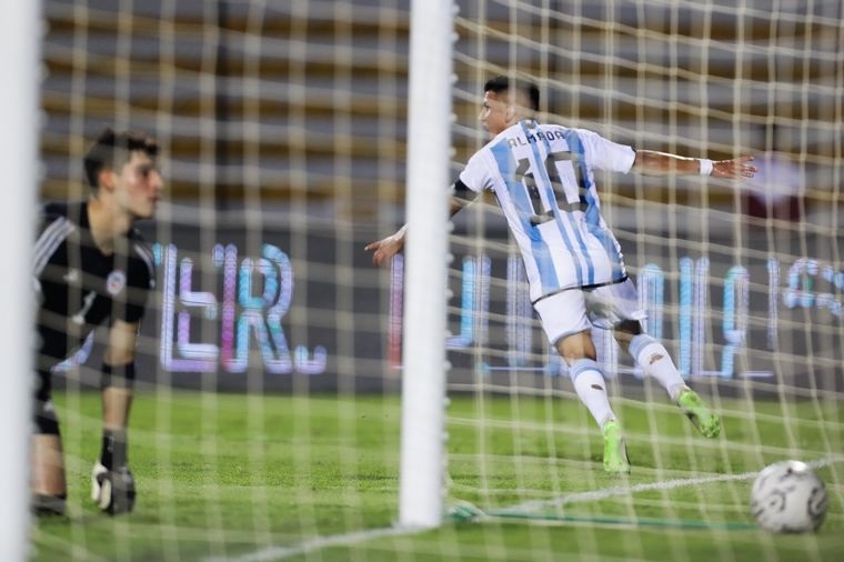 Las intervenciones de Thiago Almada y el Diablito Echeverri fueron lo más destacado en la Celeste y Blanca, pero la ineficacia de todo el frente ofensivo persiguió al equipo en la mitad inicial. Justamente, Almada probó de lejos en un avance embolsado por el arquero y tuvo revancha a los 44 minutos. Un derechazo de Santiago Castro en la medialuna provocó el rebote de Vicente Reyes y el atacante con pasado en Vélez capitalizó el rebote para meter el 1-0. La buena actuación del seleccionado nacional al cierre del primer tiempo fue seguida de cerca por el presidente de la Asociación del Fútbol Argentino (AFA), Claudio Tapia, quien estaba presente en el palco atento a la labor de los conducidos por el Jefecito.