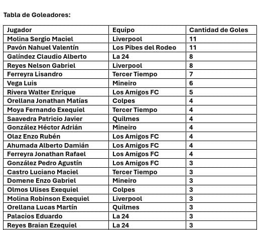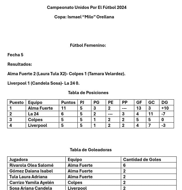 También se consignan los detalles del torneo del Fútbol Femenino, con los resultados y goles de la Fecha 5, la Tabla de Posiciones del FF y las goleadoras: