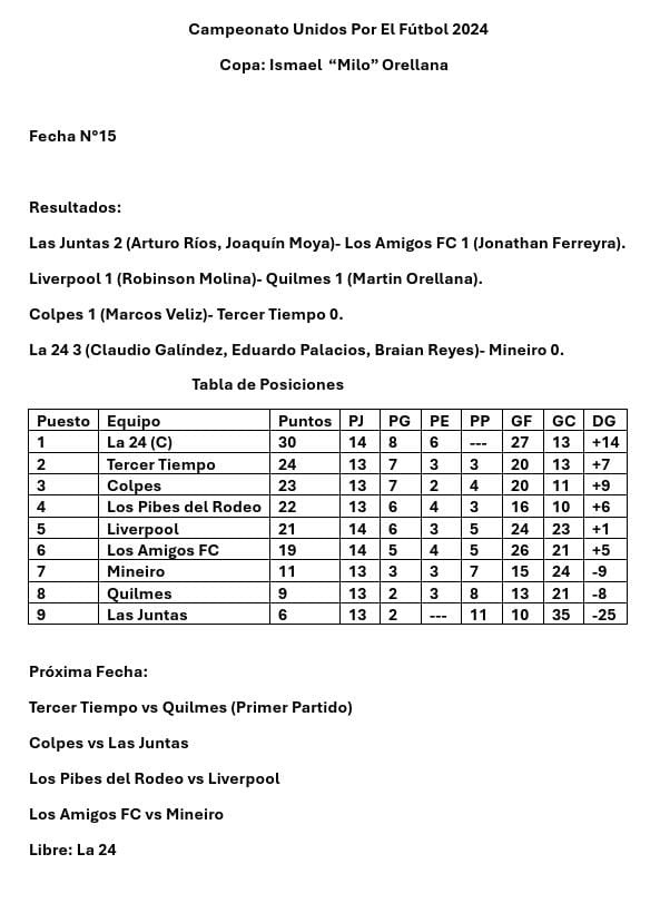 En los cuadros y gráficos que complementan esta información, se consignan los resultados y goles de la Fecha 15, la Tabla de Posiciones en el Torneo masculino, los próximos partidos (Fecha 16), goleadores, jugadores suspendidos, jugadores habilitados.