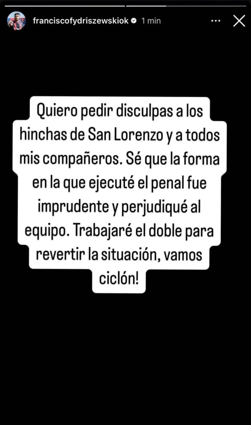 “Quiero pedir disculpas a los hinchas de San Lorenzo y a todos mis compañeros. Sé que la forma en la que ejecuté el penal fue imprudente y perjudiqué al equipo”, expresó el atacante, que ya tiene un par de antecedentes pateando a lo Panenka en Argentinos Juniors y Lugo de España.