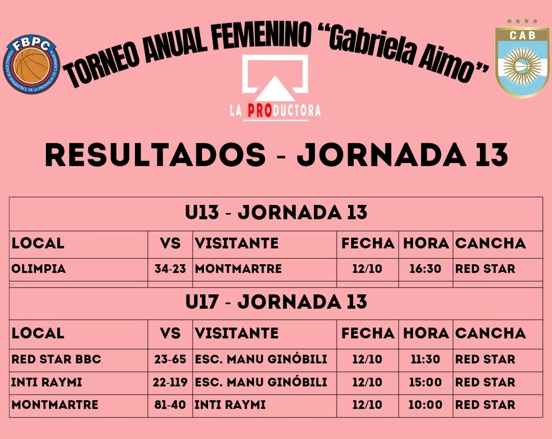Por la U17, hubo doble victoria de Escuela Manu Ginóbili de Tinogasta, frente a Inti Raymi (119-22) y Red Star (65-23). Por su parte, Montmartre derrotó por 81-40 a Inti Raymi.