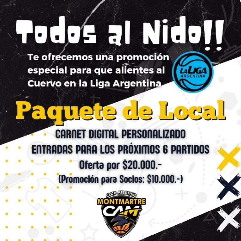 Después del debut con un estadio colmado en su tercera temporada en la Liga Argentina de Básquetbol, el Club Atlético Montmartre presentó una propuesta especial para que sus hinchas continúen llenando las tribunas del Nido, su cancha ubicada en Dr. Navarro esquina Schunk, del Barrio Achachay. La oferta incluye un paquete de local para los seis encuentros que restan en su casa hasta que termine el año.