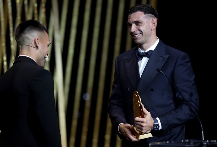 Pero hubo otros compatriotas que estuvieron en el Théâtre du Châtelet de la capital francesa. Lautaro Martínez finalizó séptimo por su gran año en el Inter y lo decisivo que fue en la Copa América con la celeste y blanca. Mientras que Emiliano Martínez quedó 18° en el listado general, siendo el único arquero entre los 30. Y, lógicamente, se llevó el premio Lev Yashin por segundo año consecutivo por ser el mejor en su puesto. Las atajadas que le valieron al Aston Villa jugar la Champions y a la Selección ser bicampeona de América. El orgullo argentino bien alto.
