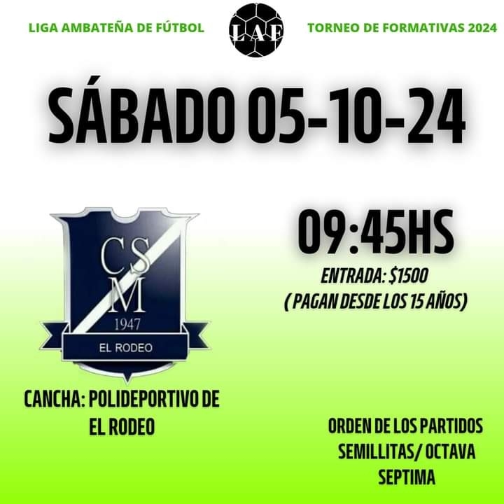 A todo esto, para este sábado 5 de octubre, fue anunciada la disputa de la 2da. fecha de las divisiones formativas Ambateñas, que tendrá escenario en el Polideportivo de El Rodeo, a partir de las 9:45 hs.