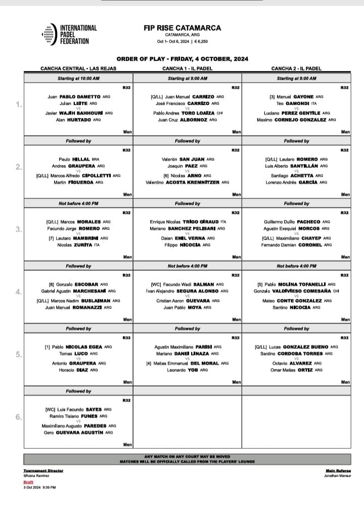 Y la presentación de los catamarqueños Agustín Morcos y Guillermo Pacheco, ante Chayep-Coronel, cerca de las 13.00 en cancha 2 de Il Padel. La de Mariano Pelisari, junto a su compañero Nicolás Trigo, ante Nicocia y Verna, en la cancha 1, también a las 13.00. Completando el andar de los catamarqueños, con los wild card: Iván Segura y Facundo Salman, que jugarán contra el mundialista juvenil en 2021 y 2023: el de Catamarca por adopción: Aaron Guevara, y el riojano Juan Pablo Moya, a las 16.00 en Il Padel; y la de Facundo Sayes y Ramiro Funes, jugando contra Gero Guevara y el chamicalense Maxi Paredes, a las 20.30 (horario aproximado), en Las Rejas.
