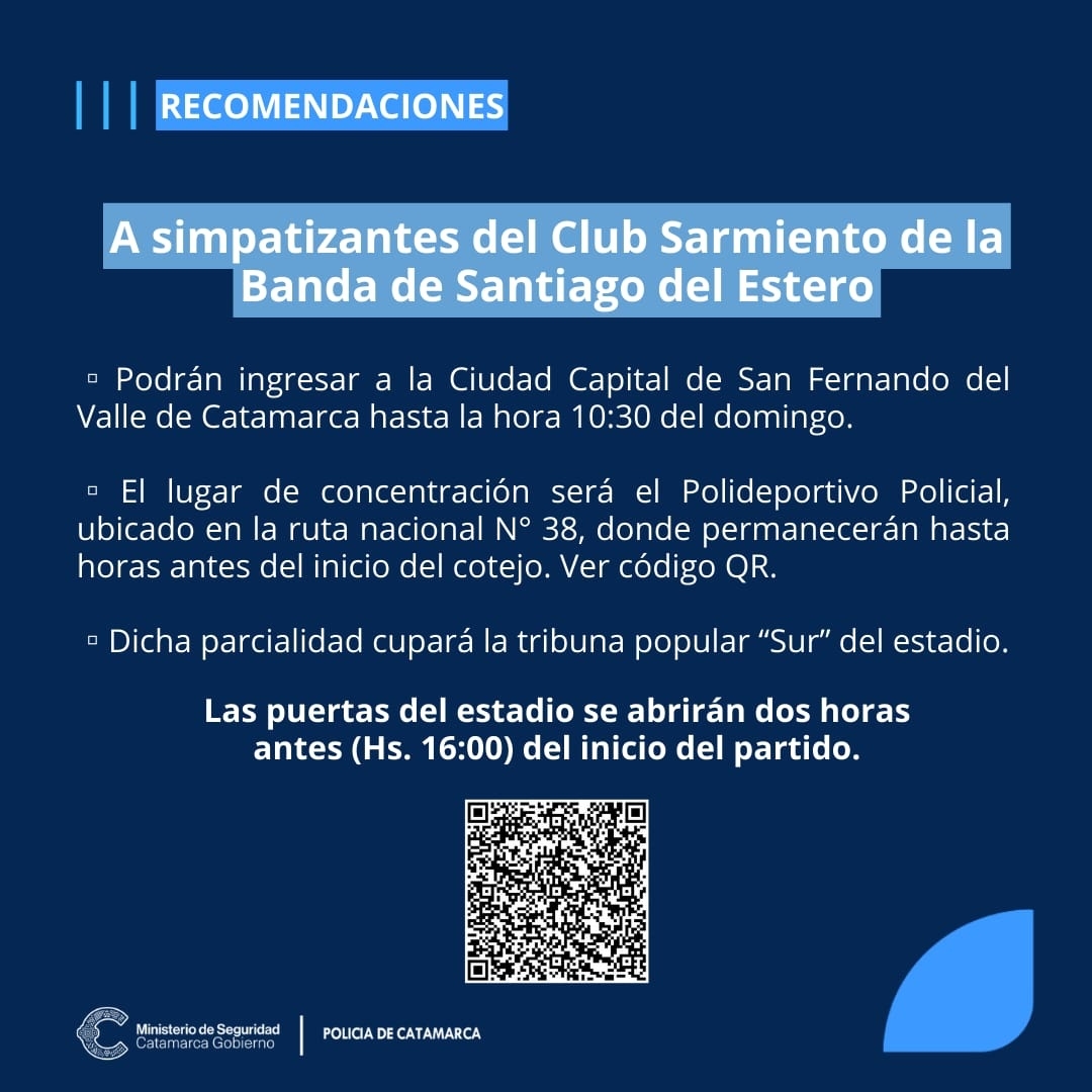 Para acceder a presenciar este cotejo, los simpatizantes del Club Sarmiento de La Banda, Santiago del Estero, deberán ingresar a la ciudad de San Fernando del Valle de Catamarca, hasta la hora 10.30 del domingo”, pasando a concentrarse en “el Polideportivo Policial, ubicado en la Ruta Nacional 38, donde permanecerán hasta horas antes del inicio del cotejo”, indicándose “ver el Código QR” del correspondiente flyer.