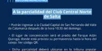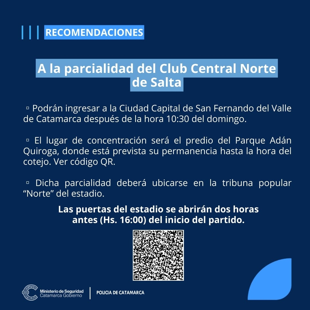 En tanto, las recomendaciones para la parcialidad del Club Central Norte de Salta, indican que “podrán ingresar a la ciudad de Catamarca, después de la hora 10.30 del domingo”.