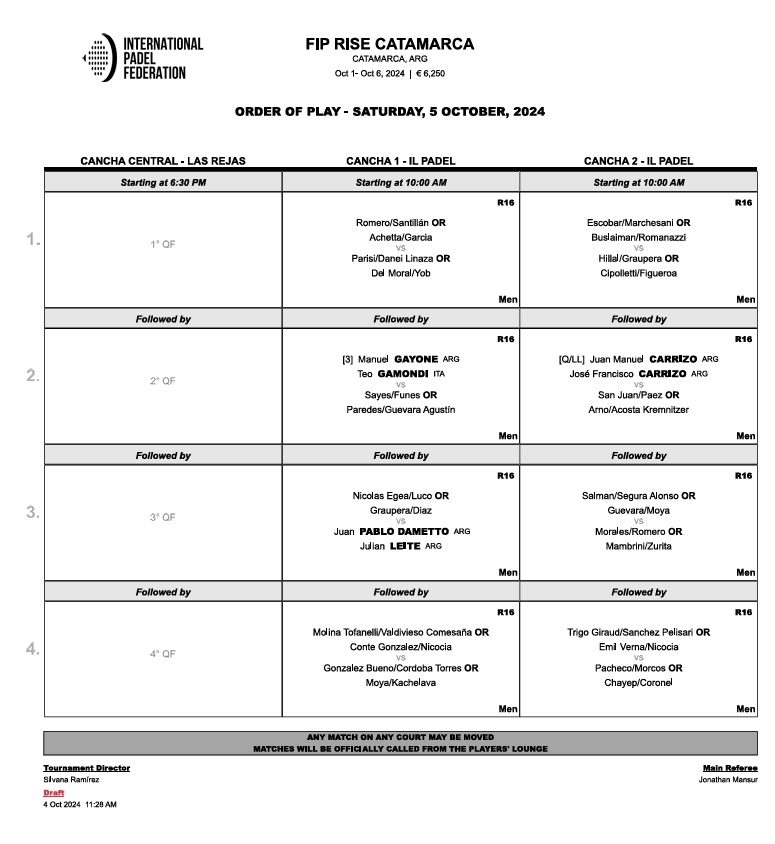 La Internacional Padel Federation dio a conocer el Orden Juego, para los partido de este sábado 05 de octubre de 2024, en el marco del Fip Rise Catamarca, que desde ayer se disputa en esta provincia.