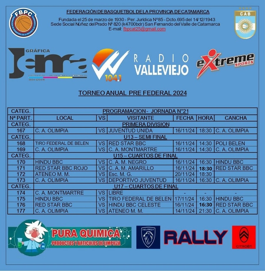 En Primera, Olimpia recibe a Juventud Unida de Tinogasta este sábado desde las 18.30 hs. Por el lado de la U13, disputarán Semifinales al mejor de tres juegos. En Belén, se miden Tiro Federal y Red Star BBC. La otra llave será Olimpia vs Montmartre.