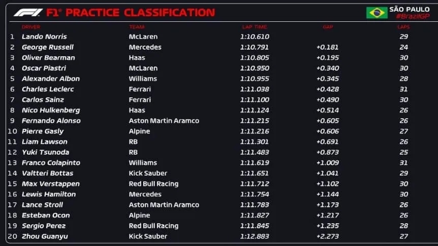 El reglamento de la FIA señala que en caso de no realizarse la clasificación se tomarían los tiempos de la última práctica, que en este caso serían las prácticas libres 1, en la que Franco Colapinto terminó 13ro., mientras que los primeros tres serían Lando Norris, George Russell y Oliver Bearman, respectivamente.