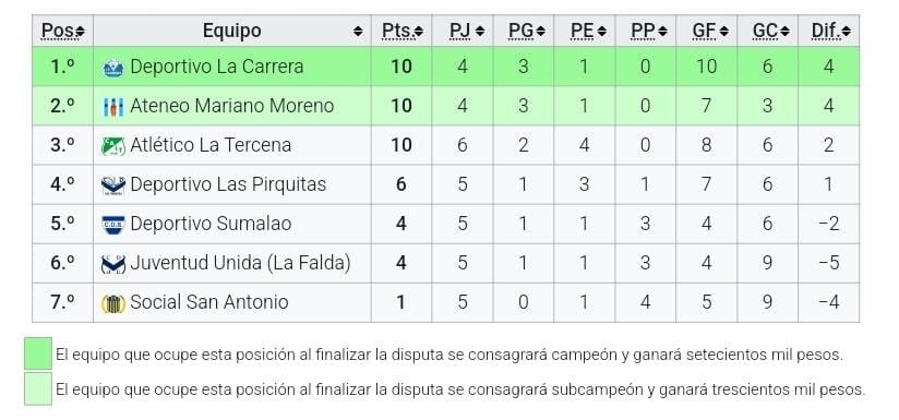 La Carrera 3 - Deportivo Sumalao 2. Goles: Gustavo Cárdenas (2) y Luciano Segura (LC); y Ricardo Ramírez y Benjamín Baigorria (DS).