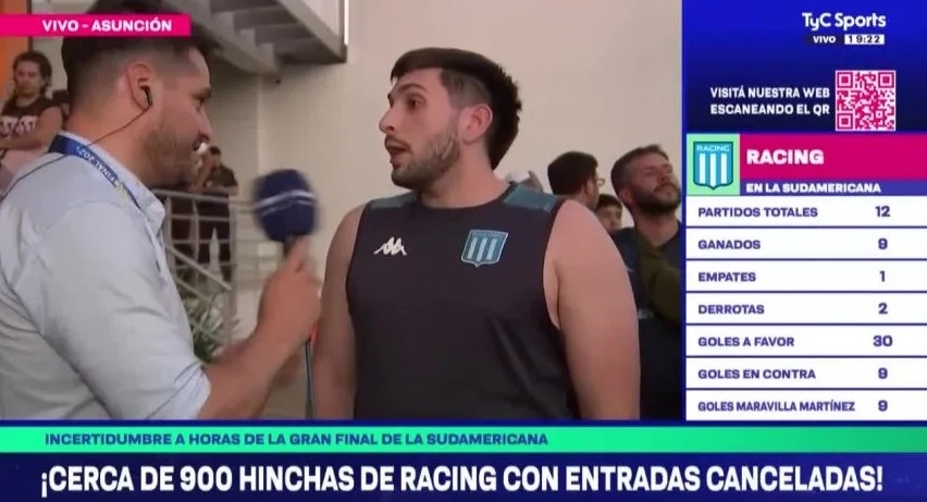 Las horas previas a la final de la Copa Sudamericana 2024 que enfrentará a Racing con Cruzeiro transcurren entre el nerviosismo, la ilusión... y el desconcierto. Al menos, para cientos de hinchas de La Academia -900, según se afirma- que recibieron este viernes un aviso de que se quedan sin las entradas que ya habían comprado.