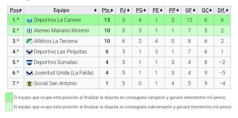 Así continúa, 7ma fecha (última): Ateneo Mariano Moreno vs. Juventud Unida, Las Pirquitas vs. La Carrera, Deportivo Sumalao vs. Social San Antonio. Libre: La Tercena.