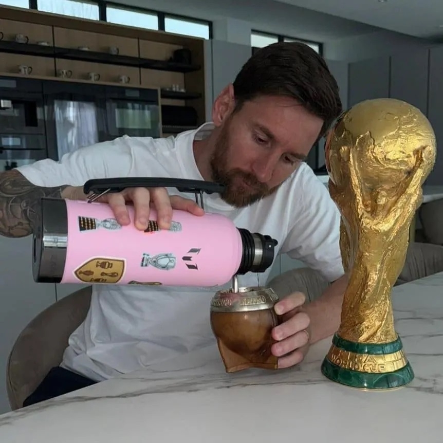 Además, el termo incluye un parche que celebra estos logros. La segunda imagen lo muestra en un momento de calma, cebándose un mate y disfrutando el momento. Sin dudas, un gesto que refleja la sencillez que lo caracteriza al astro del fútbol mundial.