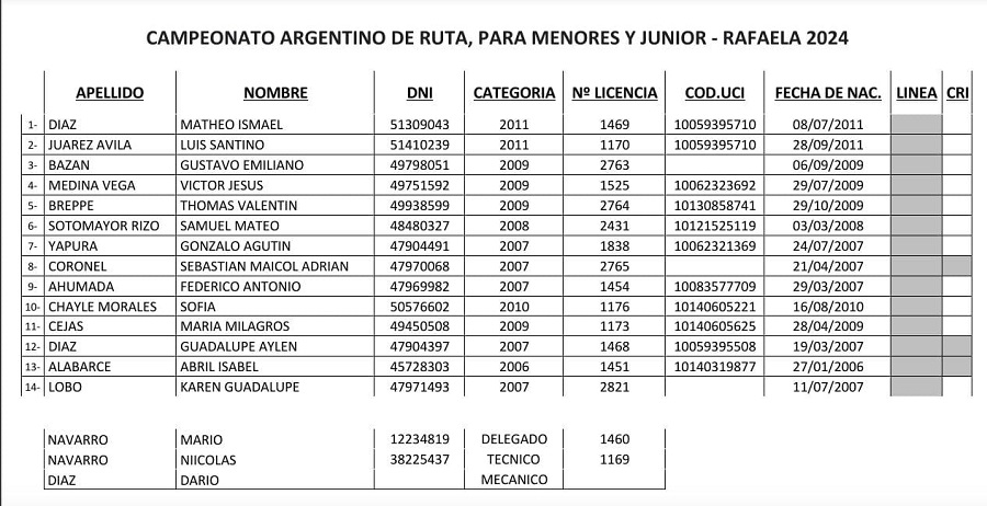 Los jóvenes ciclistas convocados: Mateo Ismael Díaz (2011), Luis Santino Juárez Ávila (2011), Gustavo Emiliano Bazán (2009), Víctor Jesús Medina Vega (2009), Thomás Valentín Breppe (2009), Samuel Mateo Sotomayor Rizo (2008), Gonzalo Agustín Yapura (2007), Sebastián Maicol Adrián Coronel (2007), Federico Antonio Ahumada (2007), Sofía Chayle Morales (2010), María Milagros Cejas (2009), Guadlupe Aylen Díaz (2007), Abril Isabel Alabarce (2006) y Karen Gudalupe Lobo (2007).