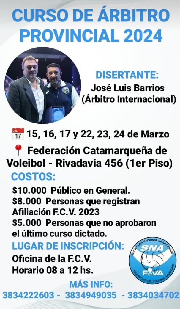 Las actividades, a cumplirse los días 15, 16, 17, 22, 23 y 24 de este mes, tendrán lugar en la sede de la Federación de Vóleibol, sita en la calle Rivadavia 456, 1er. Piso, de esta Capital.