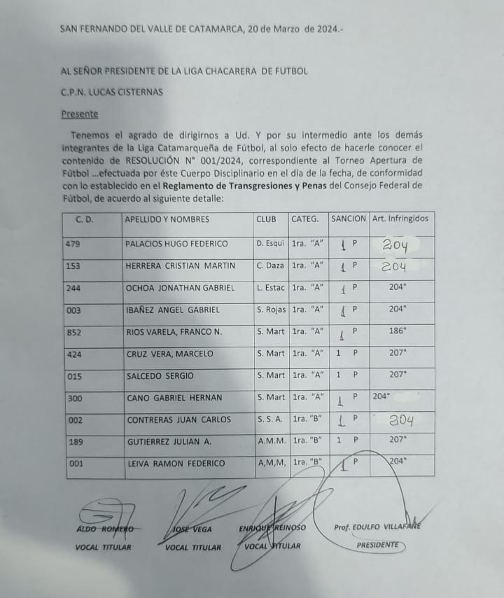 Mientras, por la divisional de ascenso, fueron suspendido con un (1) partido: Juan Carlos Contreras (SSA), Julián A. Gutiérrez (AMM), Ramón Federico Leiva (AAM).