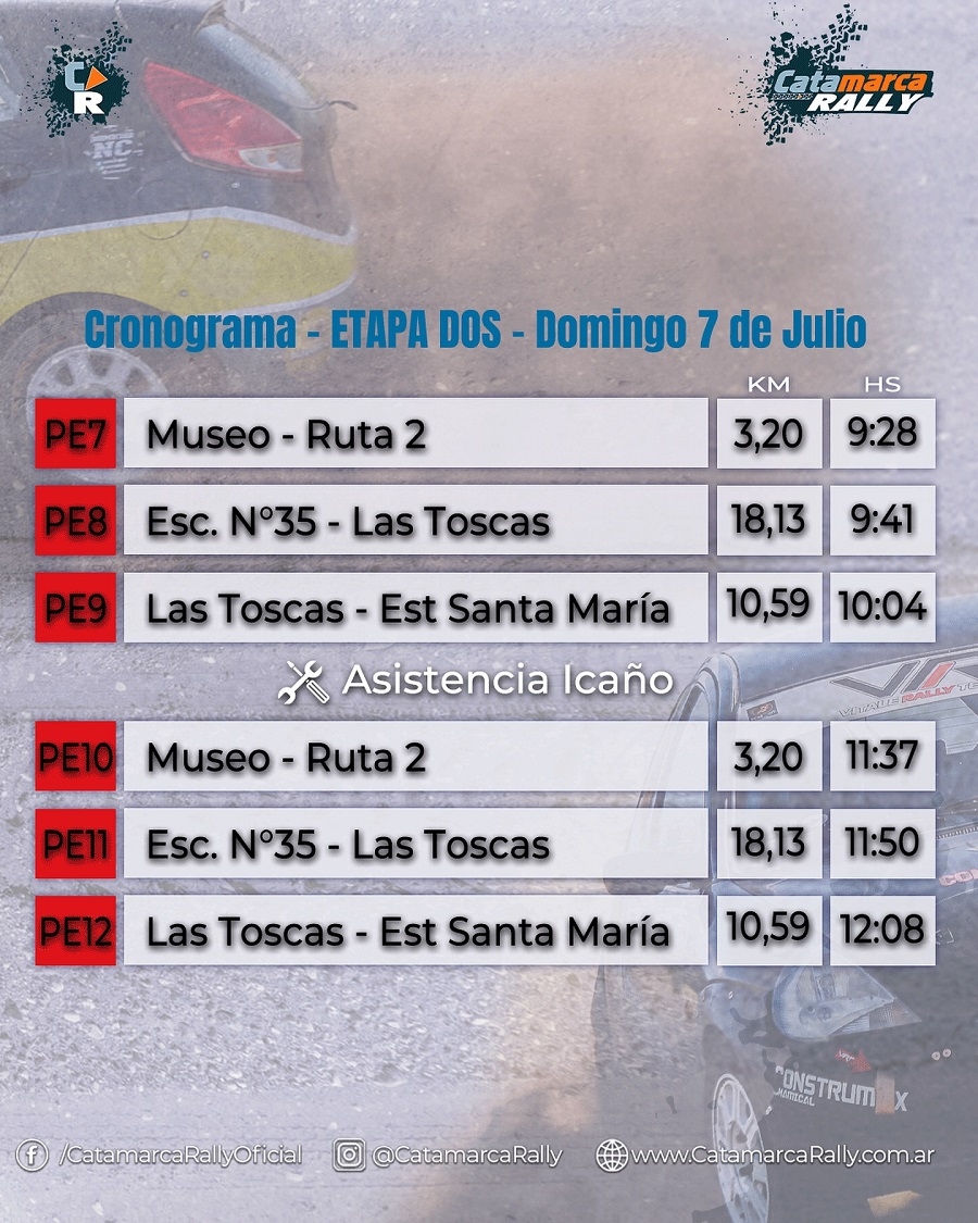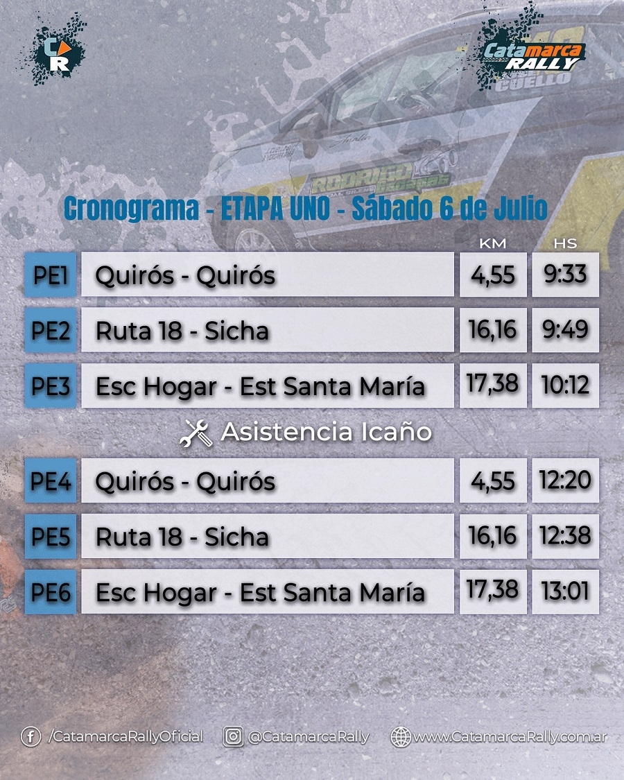 La acción cronometrada será con su primera etapa, el sábado 6 de julio, con tres tramos realizados en dos oportunidades: El primero “Quirós – Quirós” de 4,55km a las 9.33 y 12.20hs, el segundo “Ruta 18 – Sicha” de 16,60km 9.49 y 12.38hs, en tanto que el tercero será Esc. Hogar – Est Santa María” de 17,38km 10.12 y 13.01hs.