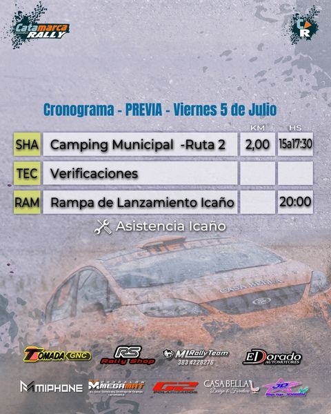 El viernes 5 de julio todo inicia con el shakedown de 2,00km entre el Camping Municipal y Ruta2 en el horario de 15 a 17.30hs. Por la noche la rampa de lanzamiento será en la plaza principal a las 20hs. En conjunto se llevarán a cabo las verificaciones administrativas y técnicas de 16 a 19hs en la hostería municipal.