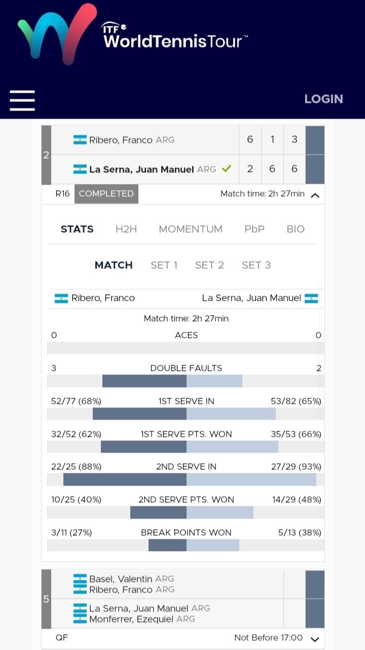 En jornada de jueves, y en aproximadamente 2 horas y media de partido, Manu La Serna superó al también argentino Franco Ribeiro, por 2-6, 6-1 y 6-3; en el 8vos del Singles (venía de dejar en el camino en 1ra Ronda al local Mateya Stanisavljevic), y ya está otra vez en 4tos en el M15 de Kursumlijska Banja (Serbia).