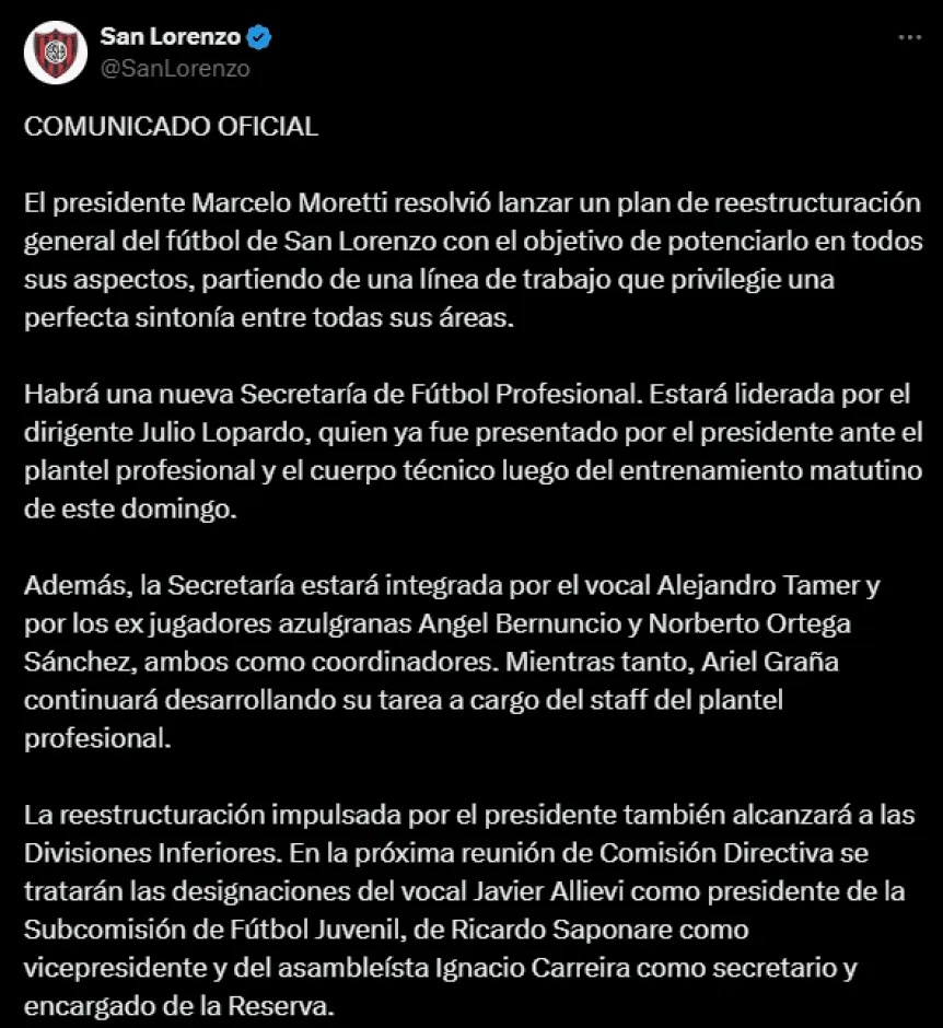 "Habrá una nueva Secretaría de Fútbol Profesional. Estará liderada por el dirigente Julio Lopardo, quien ya fue presentado por el presidente ante el plantel profesional y el cuerpo técnico luego del entrenamiento matutino de este domingo", reza el inicio del comunicado, que además se encarga de destacar que la decisión fue tomada por "el presidente Marcelo Moretti". En tanto, el vocal Alejandro Tamer y los exjugadores Ángel Bernuncio y Norberto Ortega Sánchez serán los otros tres integrantes del flamante órgano directivo.